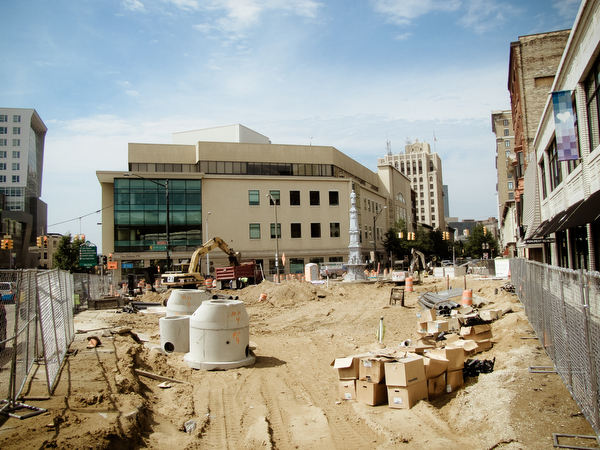 Those fits and starts are all about to drastically change as these two studios join the growing list of projects on that corner. 616Development is nearing completion of its remake of the long vacant Kendall Building into a mixed use complex that will include apartments, its new company headquarters, and a new ground floor tenant to be announced soon. The complete revamp of Monument Park is also well underway, with plans that include two new streetscape plazas, movement of the monument to a more prominent spot on the corner, new trees, and brick pavers that will better tie the park into Monroe Center to the West.