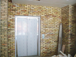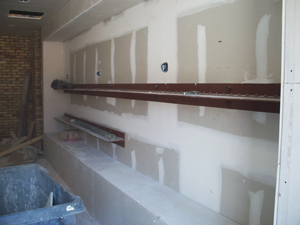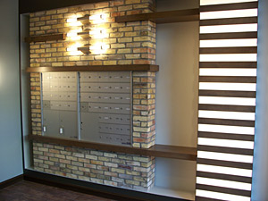 Over the past couple of weeks the original brick façade of the first building has been recycled as brick cladding on the interior commercial and residential lobbies. Two steel structural beams are now art elements incorporated into the wall of the commercial lobby for the building along Weston St.