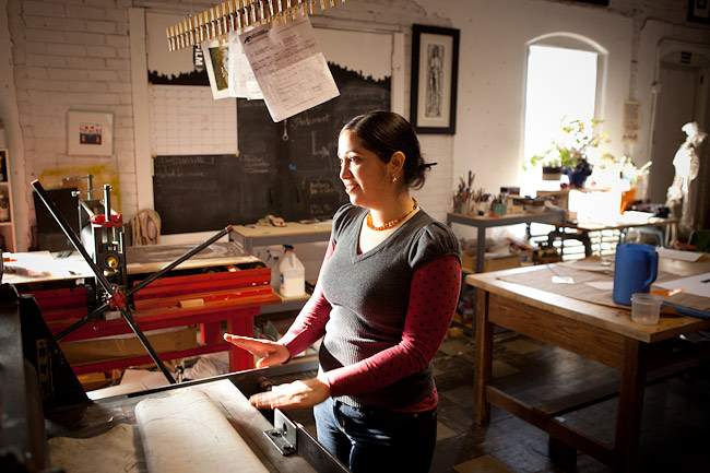 She says the aspects of block printing — its bold, expressive lines, its rich and ancient history of spreading information to all people — are what attracted her so strongly. It helped her see the world, and her relationship with it.