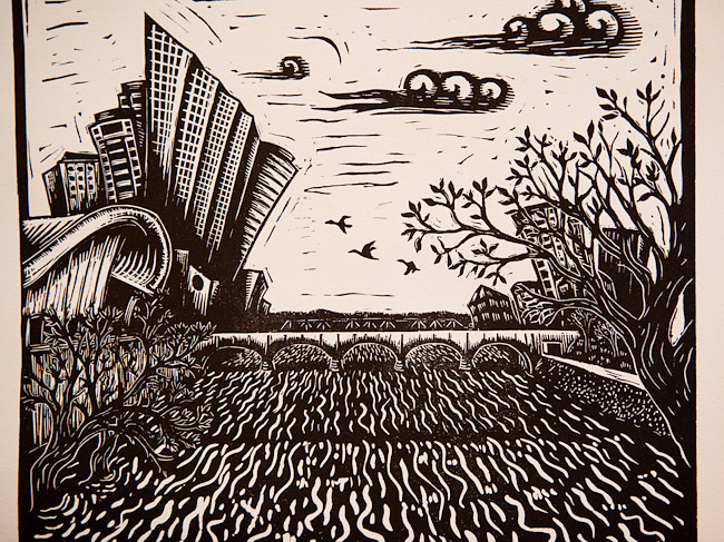 “Letting it happen” has been the 35-year-old’s artistic experience since setting up shop in her Grand Rapids Tanglefoot Studio in 2005. Skeletons, of course, are far from her only subjects. Corn and seeds, introspection, procrastination, barefoot walkers, trees and rivers and lakes and myriad of other images make up her work. She has created thousands of prints, carved from wood blocks, inked, pressed and hung to dry. As Guerra tells it, art was far from her first career choice as a child, but a high school scheduling snafu changed her path.