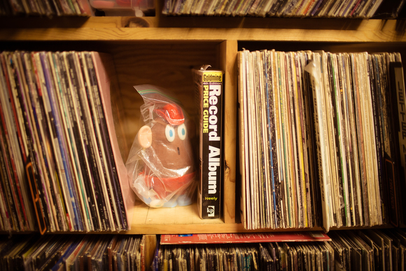 As Dodds slowly evolves into a new era of ownership, what is clear is that the walls will be covered in choice goodies, relics of the past and hilarious juxtapositions, like the pop star Tiffany’s baby-faced first album cover placed next to a provocative cover shot of her from an old gentleman’s magazine, along with a wacky array of PotaoeBabies mementoes, of which there are plenty as Smith’s popular band hits the 25 year mark this year. “Maybe finally I can park a car in my garage. I’ve got a two stall garage that kind of looks like this,” Smith said, gazing around the shop. Other novel touches that can be enjoyed around the clock include the “Vinyl Cam” that live streams a spinning turntable, complete with sound, viewable on the store’s website and the “TeleVinyl” monitor in the storefront window that plays old movies and cartoons at night. “I’m sure every time someone comes in here it’s going to be a little different,” said Smith.