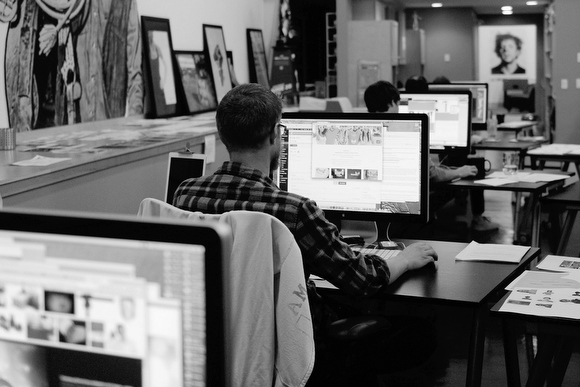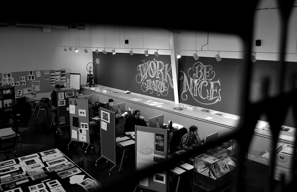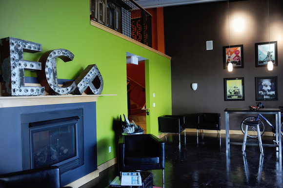 At about 4,200 square feet, ECP’s new home affords its team around 1,000 extra square feet of floor space to work with, including a central kitchen and fireplace, shower/lockers, bike storage, a dedicated workshop, on-site parking, and garage space for some of its larger projects. All of this new space is a huge help for a firm that does some seriously diverse work, from corporate branding and television ads to book and cover design — and a whole lot more.
