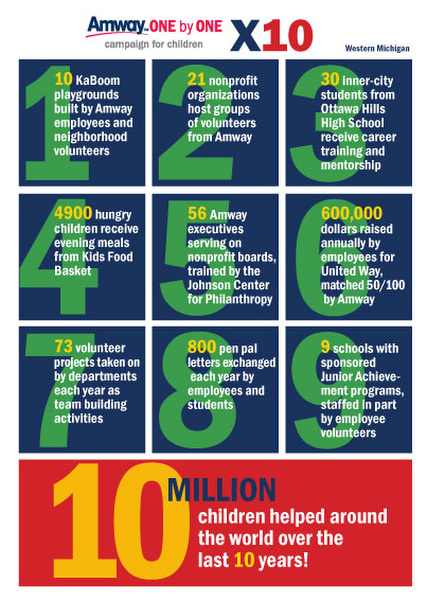 The One by One Campaign is celebrating its 10th anniversary this year and since it began, Amway distributors and employees have donated nearly 2.7 million volunteer hours to projects, causes, and organizations that benefit children. They’ve done this by working with hundreds of nonprofit organizations, government entities, and local organizations in the 100 countries around the world where Amway does business.