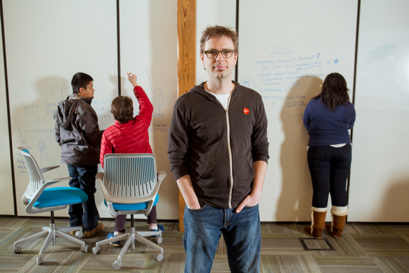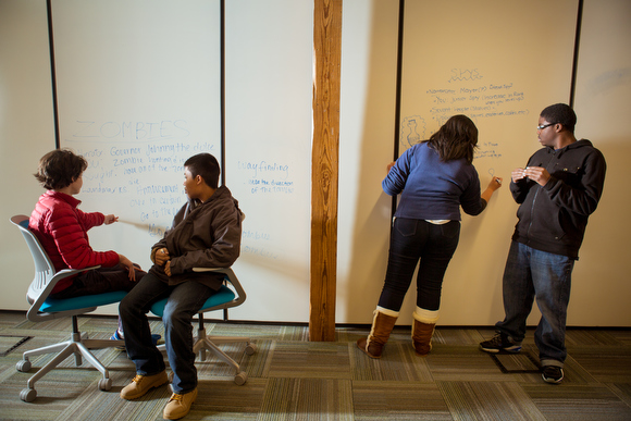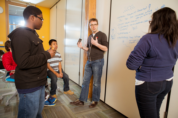 After first meeting the students and having an opportunity to lead the cohort through a downtown tour, Kelly realized the potential of educating local teens and involving them in the city’s growth. “The walk was really illuminating,” he says, as students pointed out exciting new construction and Grand Rapids staples such as the Blue Bridge that they had never before stopped to appreciate. Through their research and design of an app specifically for Grand Rapids, his “hope is that they’ll develop more appreciation of downtown,” Kelly says. As he prepares to hear the WMCAT students’ presentation, he revels at the teens’ passion for the project. “They’re great,” said Kelly. “This is one of the more exciting projects that we’ve started in 2014.”
