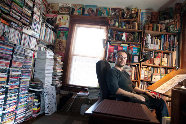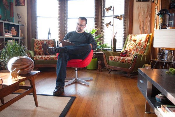 Raised among a gaggle of sisters and by an encouraging mother, Carpenter’s formative exposure to art and culture made an impression and formed a lifelong obsession. Carpenter lives in his childhood home, although he has transformed the place, creating an enviable mid-century aesthetic. “That wall there used to have a Klimt print. My friends would comment that the print had a bare breast on it. My mother had no problem displaying something like that in the living room,” says Carpenter. “She allowed me to explore Frank Frazetta’s work, probably earlier than most mothers would allow.”