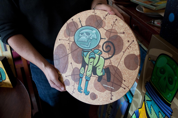 More recently, Carpenter has been doing commission work for other creative types in the Grand Rapids art community from posters and logos to CD covers. These folks seek out Carpenter because of his signature retro style. A flier for an upcoming concert featuring The Twistin’ Tarantulas and The Moonrays depicts, naturally, giant spiders and moon men raging battle on an otherworldly planet, with lasers.  He has created numerous artworks for Super Happy Funtime Burlesque, from promotional material to T-Shirt art. And, last year, Laura Caprara of StellaFly Social Media hired Carpenter for a holiday event where he captured observational gestures of party goers.