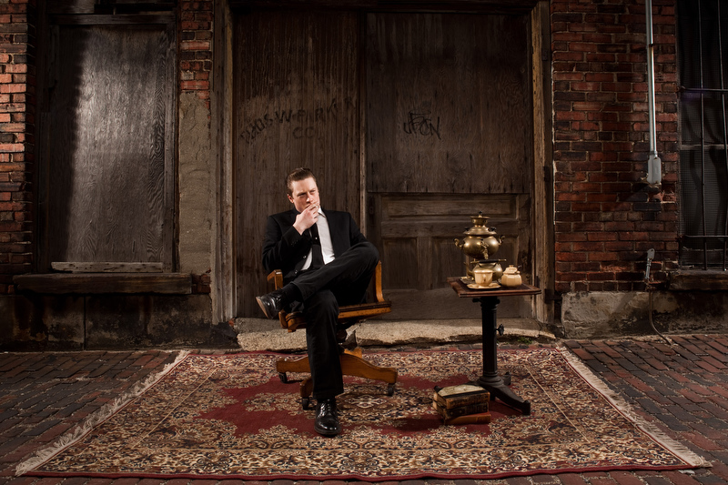 As winter starts to recede, Michael Sheppard enjoys the unseasonably warm weather outdoors and in style with a vintage samovar, joining other pieces in the alley behind The Richmond Stamp Works on Ionia. Photograph by Adam Bird
