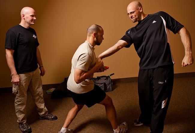 Instructor Craig Gray ran two students through a mash-up of high-speed drills. They darted and pushed, kneed and charged and, every time Gray sounded his whistle, dropped and gave him 10.