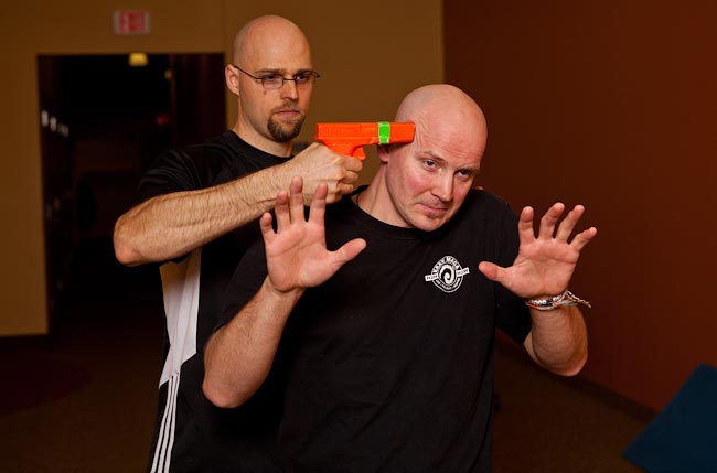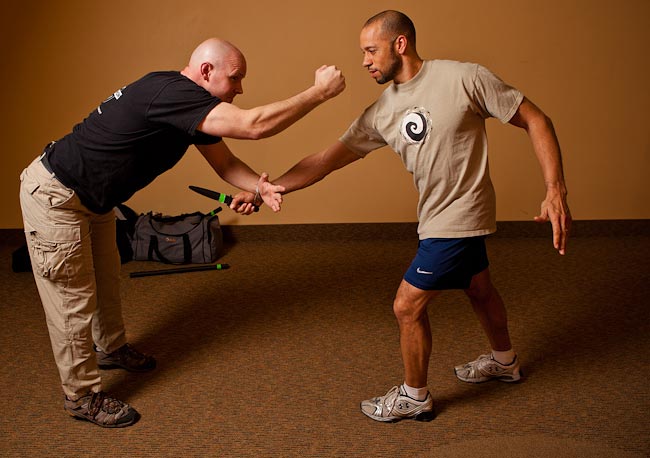 A mere 10 minutes into our demo class, Gray has already taught us a handful of basic motions to mix and match for different threats. Fifteen minutes later, I can parry Matt’s rubber knife blow.