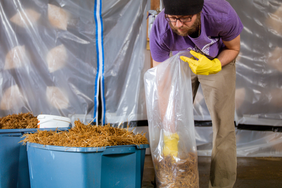 “This laminar flow hood, we built it ourselves,” he says as he points out a steel box used to prevent contamination of mushroom cultures. Light glows from the cabinet in the otherwise dark room and Clark’s face beams with pride. “These usually run around $20,000 commercially, but we were able to build one for around $300.”