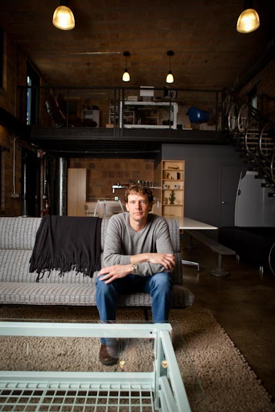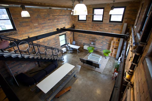 Despite the vintage appeal of the reclaimed materials in the building, many of its features are technologically innovative. The building’s underground geothermal heating system and high-efficiency lighting package are controlled by an Apple iPad application. From the tablet, Muller is able to control temperature and lighting ambiance in any of the building’s rooms manually, or with preset programs. The open interior plan of the building also makes the most of natural sunlight; on many days the offices need almost no artificial light.