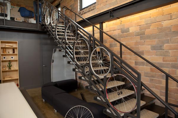 Following their focus on conservation and sustainability, many of the materials Muller and Winn used in the renovation are reclaimed from older buildings, most interestingly the now demolished Iroquois Elementary School. From the school, Chris was able to salvage lockers, flooring and bleachers, and they’ve found some interesting ways of using them. Some of these reuses, like the staircase railing made of bicycle wheels, are obvious and lend a quirky feel to the space. Most of the reused items, though, blend in seamlessly. The floor in M Retail’s office area is made from the old wooden gym flooring, and the metal grate that divides it from the rest of the space once separated the school’s weight room.