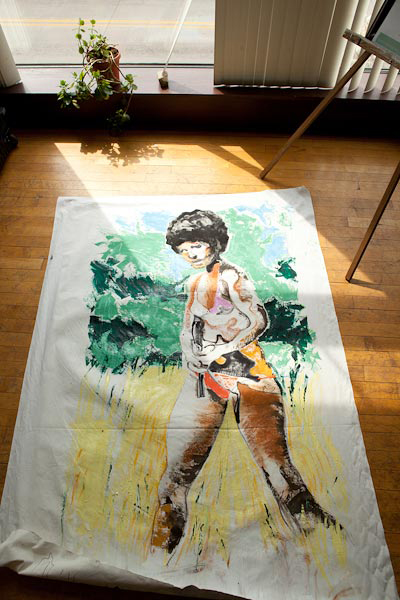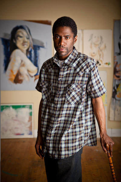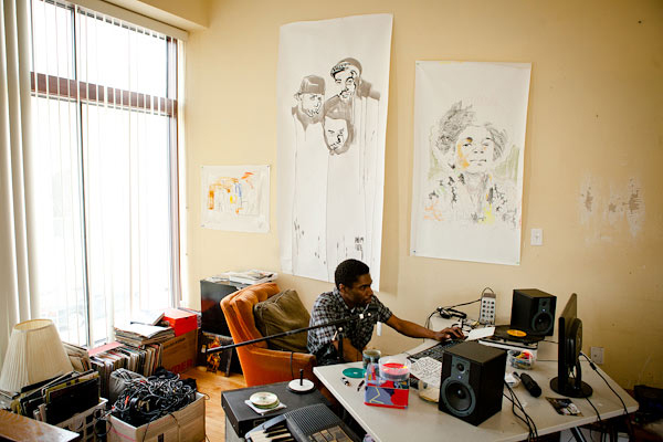 The multi-talented painter, DJ, and arts educator lives in a massive studio/ apartment in the heart of the Avenue of the Arts. His artwork covers every available surface…
