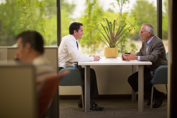 Business owner Charlie Ferro, left, talks to his mentor Bob Herr, right, a relationship started by the Jandernoa Entrepreneurial Mentoring program.