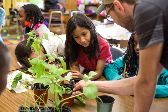 With arms propped on wooden tables in a room bursting with color — green plants and giant, multi-colored alphabet letters and a rug swimming in shades of reds and yellows and blues — a group of third grade students at Congress Elementary School swing legs above a floor that some feet don’t quite reach yet, waiting for the man they call “Farmer Mike” to explain the sea of dirt and seeds before him.