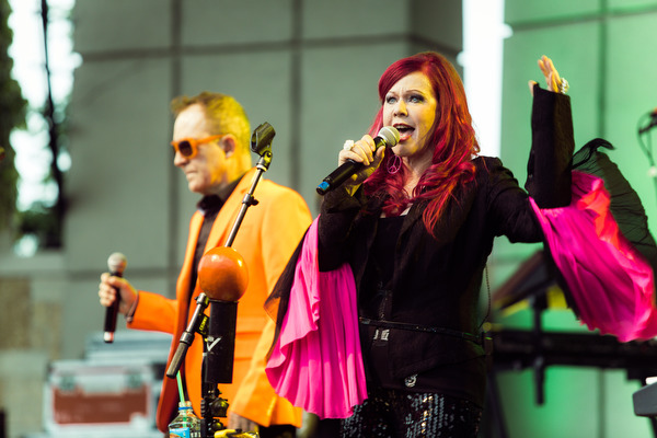 Fourth photo: Fred Schneider and Kate Pierson of the B-52’s perform to a large crowd, inspite of incliment weather.