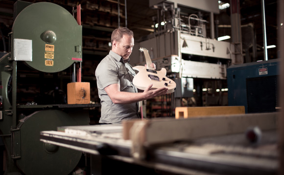 The design process for Sinuous guitars comprises a blend of computer meets handcrafted, manufactured meets old school, utilitarian meets high design. Each step of the process happens in Southwest Michigan. The guitar bodies are precision-cut by CNC machines in Grand Rapids to computer-controlled dimensions. Opatik sands and drills holes at his business in Grandville, and the bodies are sent to a local finisher. A Verve Pipe band member wires the guitars, which are then sent back to Opatik for polishing and shipping.
