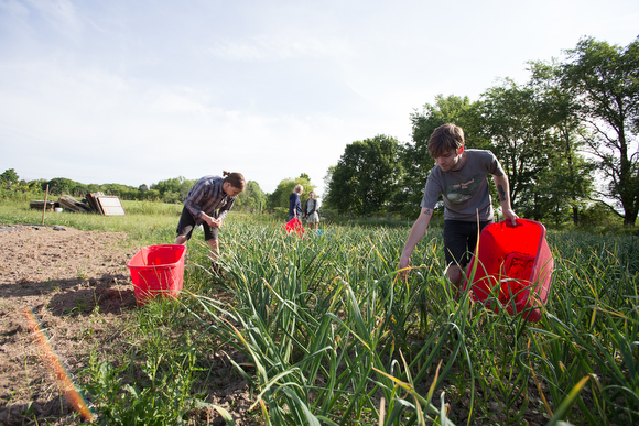 Not long after the sun first peeks its head above the horizon last Monday, its rays warming a day perched on the edge of summer, employees from Harmony Brewing and Harmony Hall head, somewhat sleepily, to Green Wagon Farm in Ada to spend the day doing everything from harvesting and planting to weeding and mowing — with much laughing and eating mixed in — during Harmony’s first-ever staff work day at the farm.
