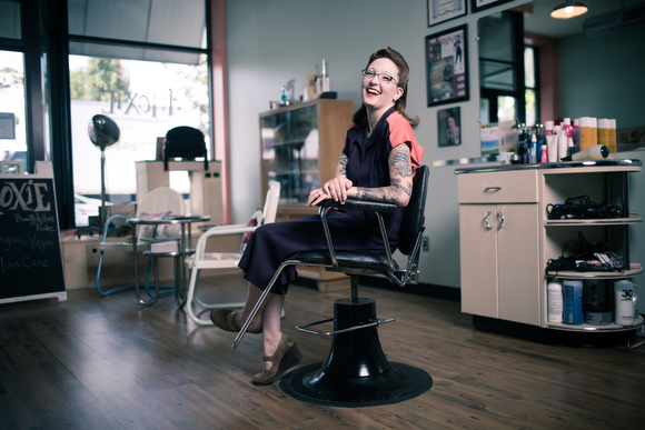 A lot of what Strowbridge does has a modern edge to it. “I combine retro and today,” she says. “Sometimes it has to be that way because of how we live our lives. A lot of what we do [at Moxie] is everyday wear, like highlights. We generally only do the retro styles for weddings or special events.” While the overall atmosphere at Moxie has a vintage feel, clients range from college professors and stay-at-home moms to artists and models. Strowbridge loves the variety. “It’s really great, we’re never bored.”