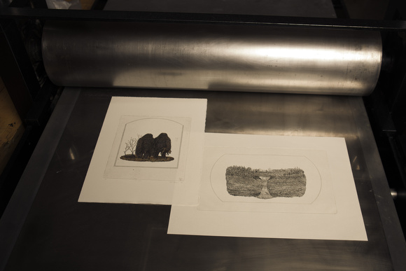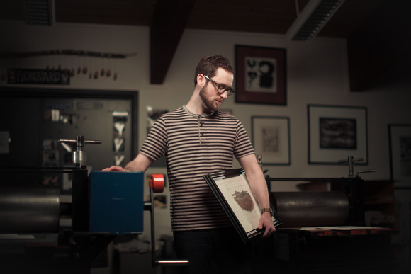 Intaglio printing is an artistic technique where the artist incises an image onto a surface, known as the plate, and the incised line or area holds the ink. Freeman creates his masterpieces by etching lines directly onto copper plates, coating them in hardground. The hardground is heated up to form a rubber-like coating over the plate. Once Freeman creates an image with an etching needle, the plate will then goes into an acid bath. The acid bath eats away at any area that is exposed, creating his works of art. “I’ve always drawn tiny, meticulously rendered things, but the capabilities of copper etching were just so unlike any other way I’d ever worked before,” says Freeman. The actual prints are developed using what could be equated to printing press.
