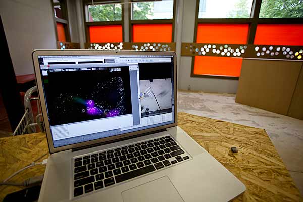 Visitors can have reflectors about an inch square stuck to the top of their shoulders as they enter ActiveSite. Spotlights in the ceiling shower invisible infrared light onto the floor, and PlayStation 3 cameras also mounted in the ceiling catch the reflections of the people as they flow through ActiveSite. The result on a large screen computer monitor resembles the graceful swirling of embers rising from a campfire — a constantly changing piece of art created by movement through space.