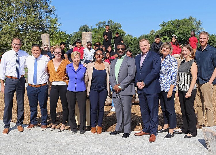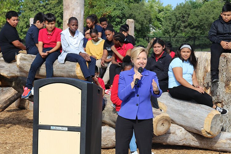 Macario was one of a large crowd of community members, Burton School students, media, and City of Grand Rapids and Grand Rapids Public Schools (GRPS) staff attending the September 17 “Sneak Peek” at the park. Other updates in the works include a sprawling rain garden, a native meadow, and the outdoor classroom, dubbed “The Nest.” Grand Rapids mayor, Rosalynn Bliss, city manager Mark Washington, Grand Rapids Board of Education President Kristian Grant, and others at the podium all gave credit to collaborations among the City, schools, community members, and private funders.