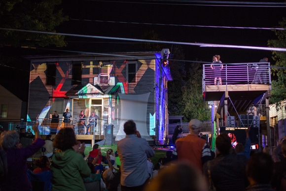DisArt’s “Hybrid Structures,” an ArtPrize entry, doubled as the show’s runway. To create “Hybrid Structures,” a complex system of ramps and platforms, DisArt partnered with artists Paul Amenta, Alois Kronschlaeger and Ted Lott. The piece, which features ramps compliant with the Americans with Disabilities Act, allows individuals to travel between three buildings at Site:Lab’s Rumsey Street site. At its highest point, people climb 16 feet, giving them a unique perspective of the location.