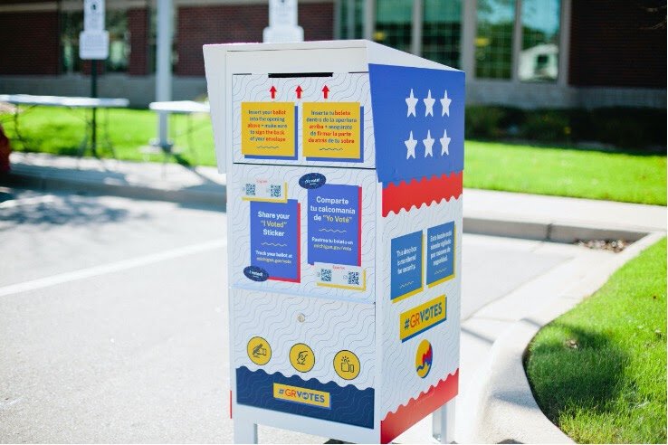 To make it easier for citizens to vote in November, the City of Grand Rapids has added six more 24/7 absentee ballot dropboxes across the city. All are monitored for security and include instructions in English and Spanish. City Clerk staff will collect ballots from the dropboxes multiple times each day. Voters can even enter a code to receive an “I Voted!” sticker.