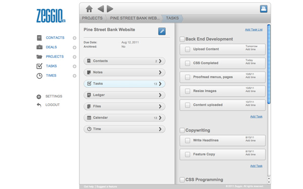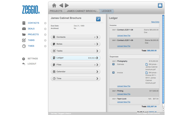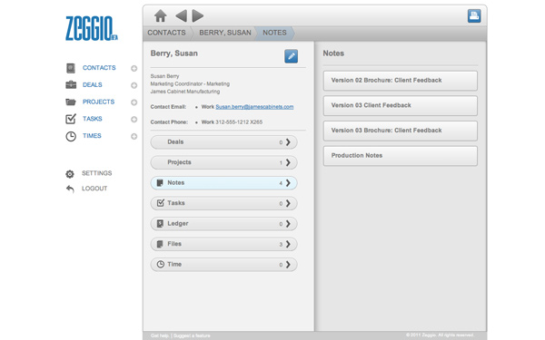 “Zeggio was built with small business owners in mind,” states Crowley. “It unifies your projects, deals, address book, files, notes and to-dos, all so you can be more confident and in control. You’ll know what’s due when, who’s responsible and how much you’ve accomplished already.”