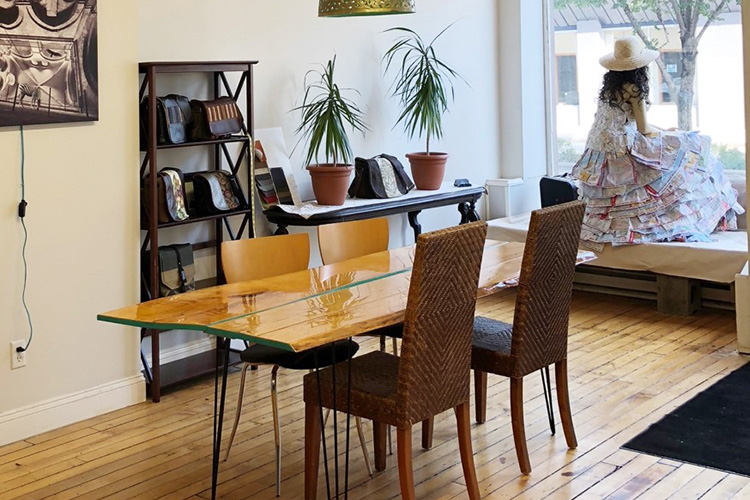 “It feels cozy and the neighborhood association is very tight,” she says. “The workshop is on site. When people come in, they are like a kids in a candy store. They get to create something that’s like a work of art. Come in, look at all the fabrics and leathers, and design a bag.”