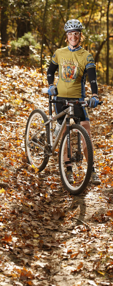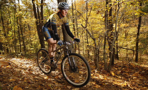 Bikers hit up the trails in the fall. The cool temperature and falling leaves are perfect for a nice, energetic ride.