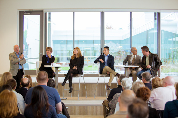 The panelists included Christian Gaines – Executive Director of ArtPrize, Austin Langlois – GVSU student from Grand Haven, Maureen Noe – President/CEO of Heart of West Michigan United Way, David Rosen – President of Kendall College, and Kristen Taylor, Development Director at UICA.
