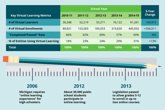 The 2006 law requiring high school students wasn’t the last piece of legislation to support online learning in Michigan. In 2008, school districts could allow eligible, full-time students to take all of their coursework online while still being enrolled. And in 2013, legislation guaranteed students could enroll in up to two online courses per semester.