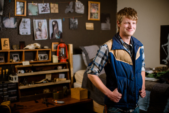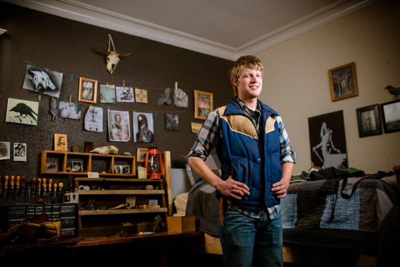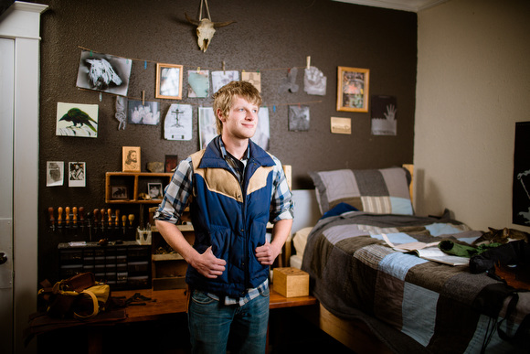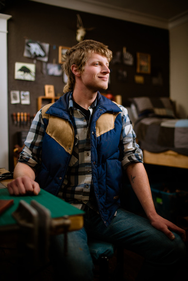 On a chilly fall evening, I arrive at an old home in Eastown to interview my ‘subject,’ Jake Vroon. Rumor has it that he’s quite the leather artisan. As I enter, Maple, the house pit bull, welcomes me to the abode. She has the softest, brindle-colored fur. It is evident that she is well loved. The house has a cool vibe, and a look around reveals why. Vroon and his roommates are all artisan crafters, and their works populate the space, spicing it eclectic.