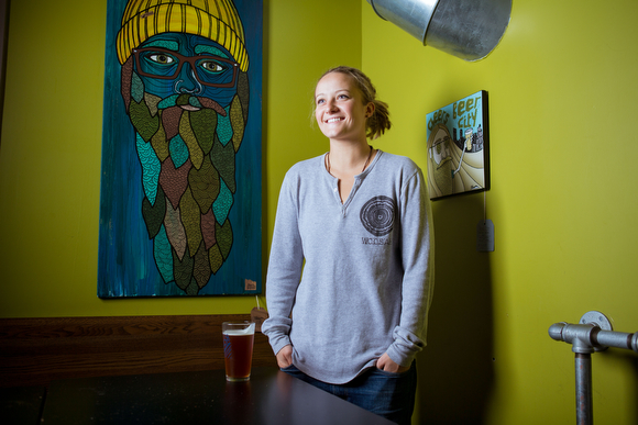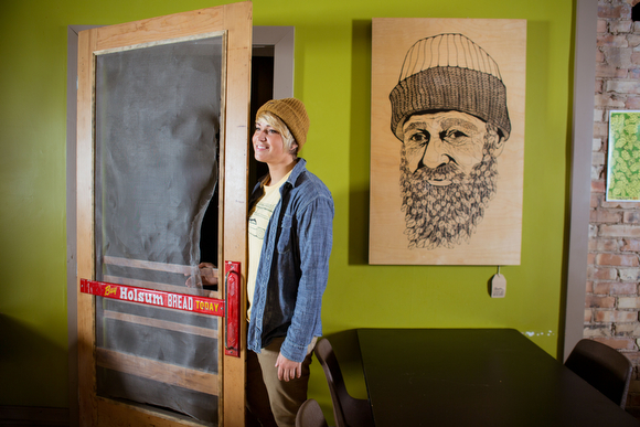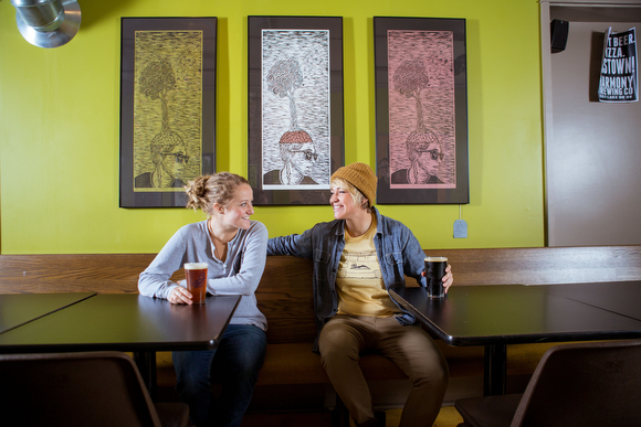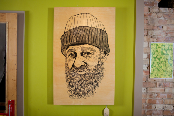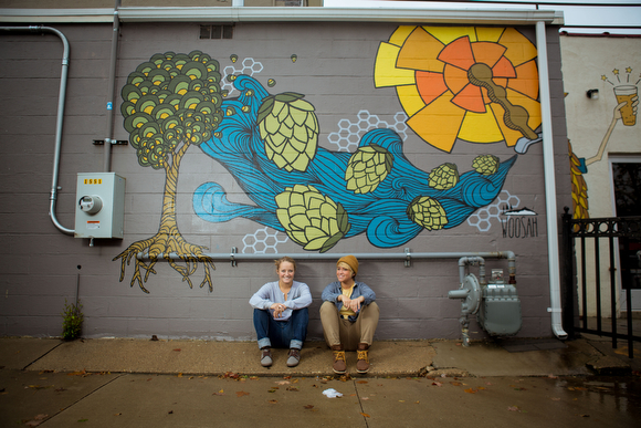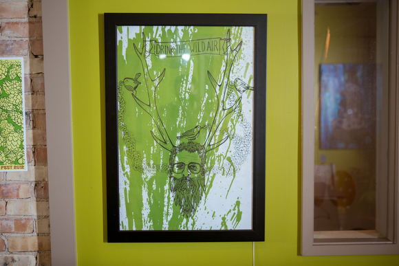 Wander into the world of Woosah Outfitters, the world of Erica Lang, 22, and Brooke Ruble, 25. Lang and Ruble are seniors at Kendall College of Art and Design, but the couple has not put off their career dreams until graduation. Their nature-based clothing line and artwork is available online and at Harmony Brewing Company at 1551 Lake Drive SE in Grand Rapids, where the two have painted a large mural on the outside of the building, but have many of their paintings and woodcuts on exhibit inside, with a woodcut as part of the restaurant’s menu.