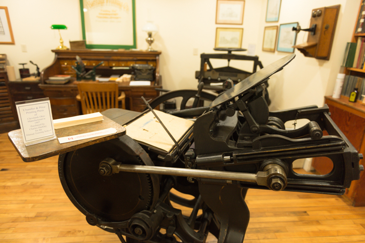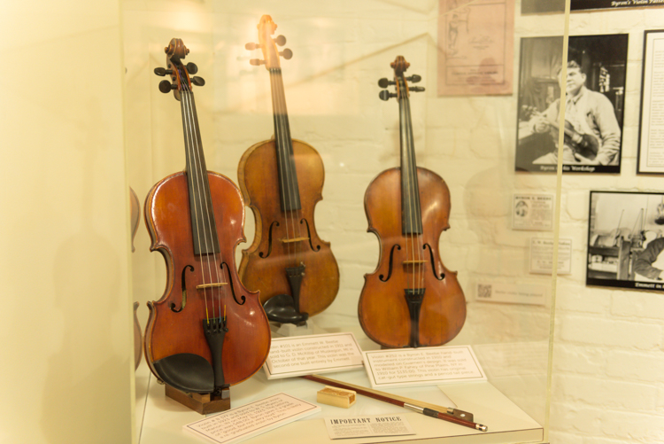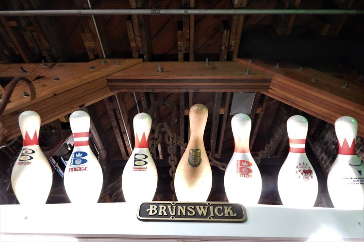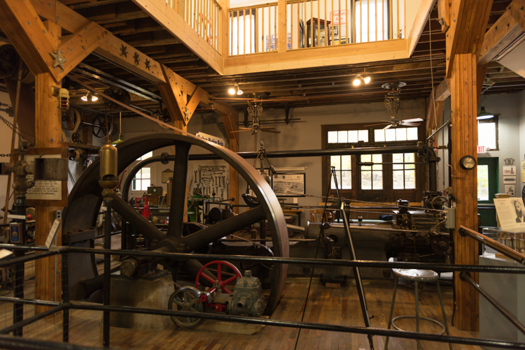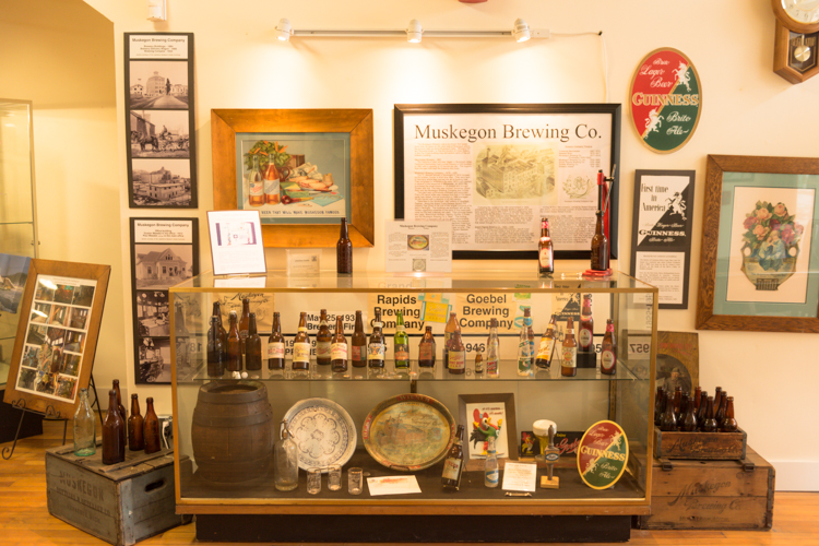 “For the most part, everything you see in the museum, we’ve added,” Dake says, pointing to exhibits that include everything from the history of beer in Muskegon (the Muskegon Brewing Co., Grand Rapids Brewery, and Goebel operated in the Lakeshore Drive space that’s now Cole’s Quality Food, and Muskegon was one of just two places in the United States that bottled Guinness) to an original Raggedy Ann doll made in 1918 and a working bowling pinsetter from Brunswick. Plus, there’s a Chase Hackley player piano that volunteers are happy to serenade visitors with, the steam engine with a line shaft that runs 11 machine tools in the museum’s back room, printing presses, and artifacts and photos from an impressively wide variety of companies that have called, or still call, Muskegon home, such as Sappi, Muskegon Boiler Works, Continental Motors, Shaw-Walker, Beebe Violins, and Alcoa, among many others.