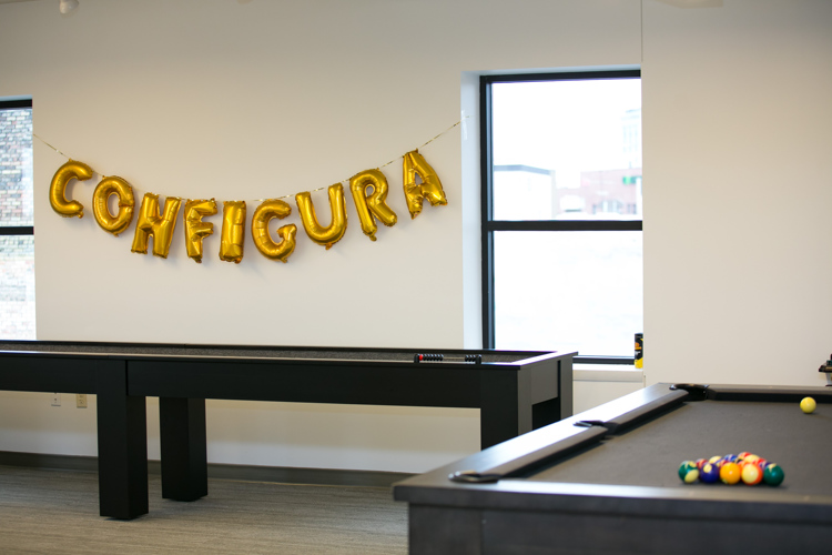Configura’s new office space also features a rooftop deck on the outside, while its interior includes a large communal area with a full kitchen, soft seating, pool and ping-pong tables, a popcorn machine, darts, and a shuffleboard alongside a “quiet room” available for taking naps and for nursing mothers.