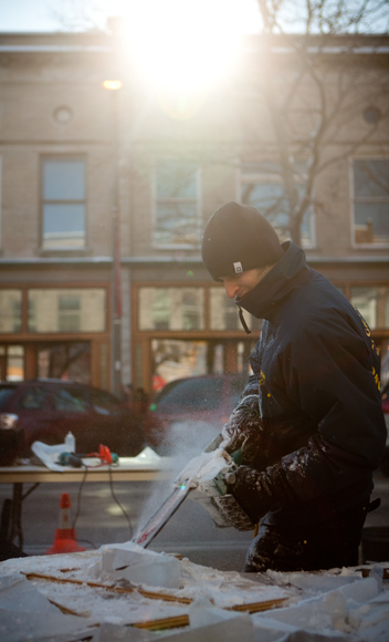 Mike Dewicki of Grand Rapids Community College works on his ice sculpture during the Collegiate Ice Sculpting Invitational in Holland.