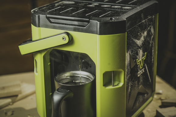 The OXX team is meticulous and thorough with its testing. The Coffeeboxx prototypes have been through a lot, brewing hundreds of gallons of coffee and hot water, brewing underneath the wheels of a parked Jeep Wrangler, and being dropped from different heights. It was taken apart and redesigned for strength and utility several times before it met the specifications the team was looking for. Vanwylen even field tested a unit over a July 4th weekend.