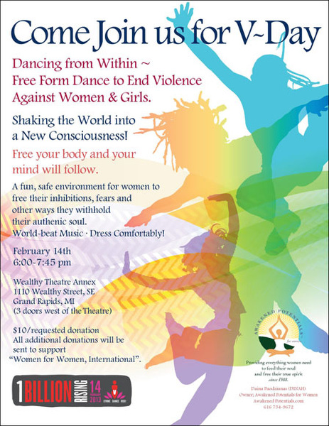 The women-only “Dance to End Violence Against Women and Girls on V-Day” event at the Wealthy Theatre Annex is a night of free-form dance hosted by Awakened Potentials’ president, Daina (Dinah) Puodziunas.