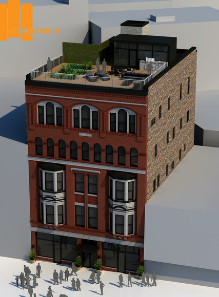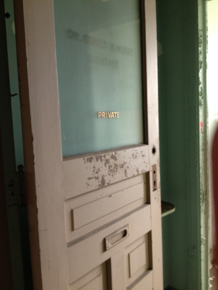 Construction plans include a rooftop deck, a large media/gathering room in the basement (which has original brick floors), and re-use of many of the building’s architectural elements. Those elements include iced-glass dental office doors with hand-painted signage on them, which will be reinvented as barn-style sliding doors for the apartments.