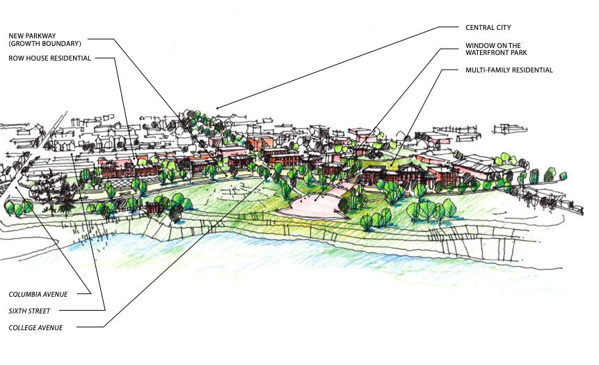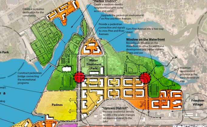 But one project could happen sooner — the development of a “Uptown District,” a 3-square-block area just north of downtown, where College Avenue meets Sixth Street. One vision is a combination of higher density retail, commercial, and residential that includes an affordable housing component. Pricier units would get the view of Windmill Island, while less-costly units would have a street view.