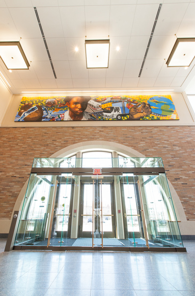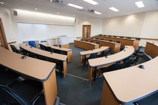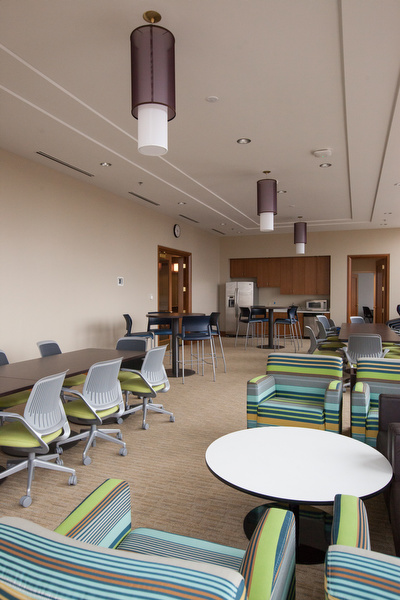 The building also offers a student lounge, a quiet study area, and 15 break-out rooms that accommodate five students for small study groups or projects. The break-out rooms are equipped with file-sharing technology and monitors so students can plug in their laptops and work on a shared project.