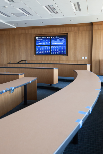The facility offers students a high-tech trading room with nine Bloomberg Training Terminals for accessing near-real-time stock market action, equipment and opportunities the Seidman College didn’t have before. The trading room, named The Gary L. Tilken Financial Markets Center, allows students to practice making trades and to conduct research.
