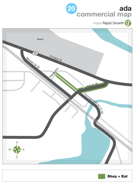 Take I-96 W toward GRAND RAPIDS. Take the M-50 exit- EXIT 52- toward LOWELL. Turn RIGHT onto ALDEN NASH AVE SE. Turn LEFT onto CASCADE RD SE. Turn RIGHT onto BUTTRICK AVE SE. Stay STRAIGHT to go onto THORNAPPLE RIVER DR SE. Cross the river and arrive in Downtown Ada.