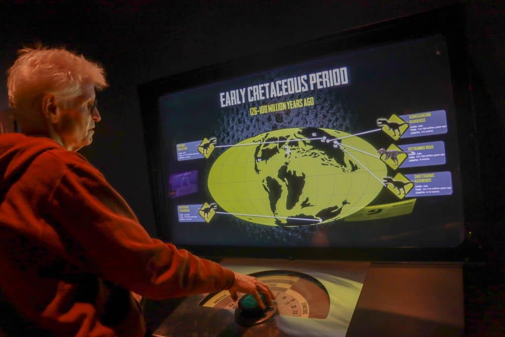 Interactive displays range from inventive video projections to hands-on applications that illustrate the movement of continents through tectonic shift graphics, all demonstrating the evolution of this species. Fossils and life-sized replicas follow the tyrannosaur lineage across millions of years, from smaller, feathered relatives like Guanlong to the formidable T. rex.