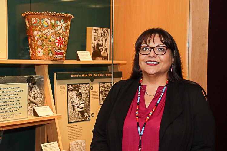 Katrina Furman, the newly appointed Anishinaabe curator and member of the Grand Traverse Band of Ottawa and Chippewa poses in front of examples of basket weaving examples.