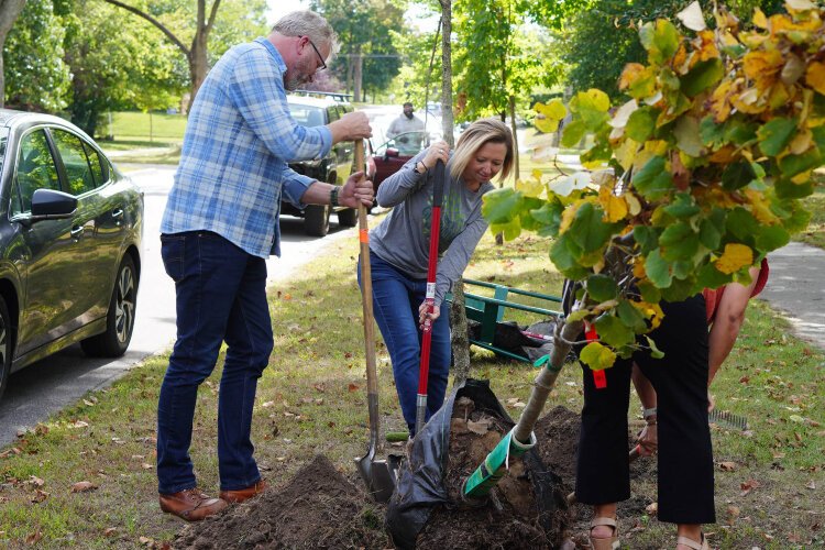 Mayor Bliss planting her final Mayor’s Greening Initiative tree as mayor with Steve Faber (Neighborwoods fall tree planting in partnership with Mayor’s Greening Initiative 2024), photo by Evie Dzomba,