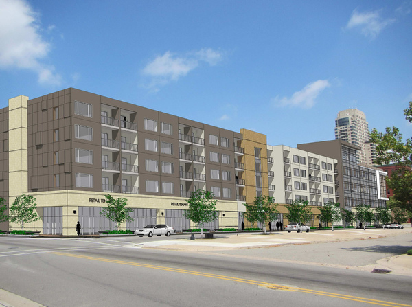The new development, called Arena Place, will run the length of a full city block on property that is now underused surface parking. The project runs south from Ottawa Avenue and Weston St. SW to Oakes St. SW, and consists of two five-level towers connected by 7,700 square feet of retail spaces for small shops.