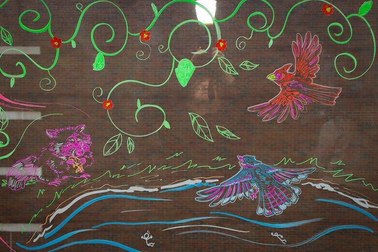The second art installation lives in the Pavillion’s Resource Library. First-year students in a drawing class created a window mural using window paint markers. Titled ‘Michigan Over and Under,’ the piece celebrates Michigan’s nature. The windows feature wildlife drawings, including beasts, birds, fish, and flowers.